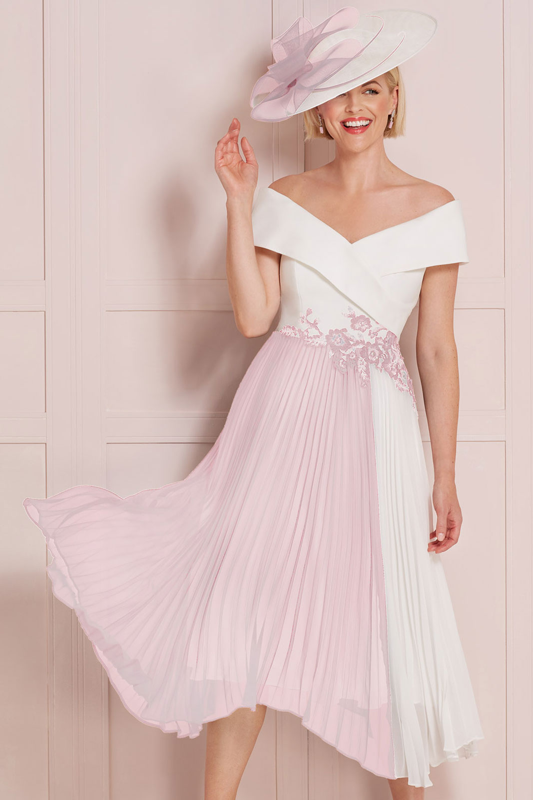 Floaty A-line Mother of the Bride dress with Bardot neckline and floaty chiffon pleated skirt rose pink and ivory. Perfectly pretty.