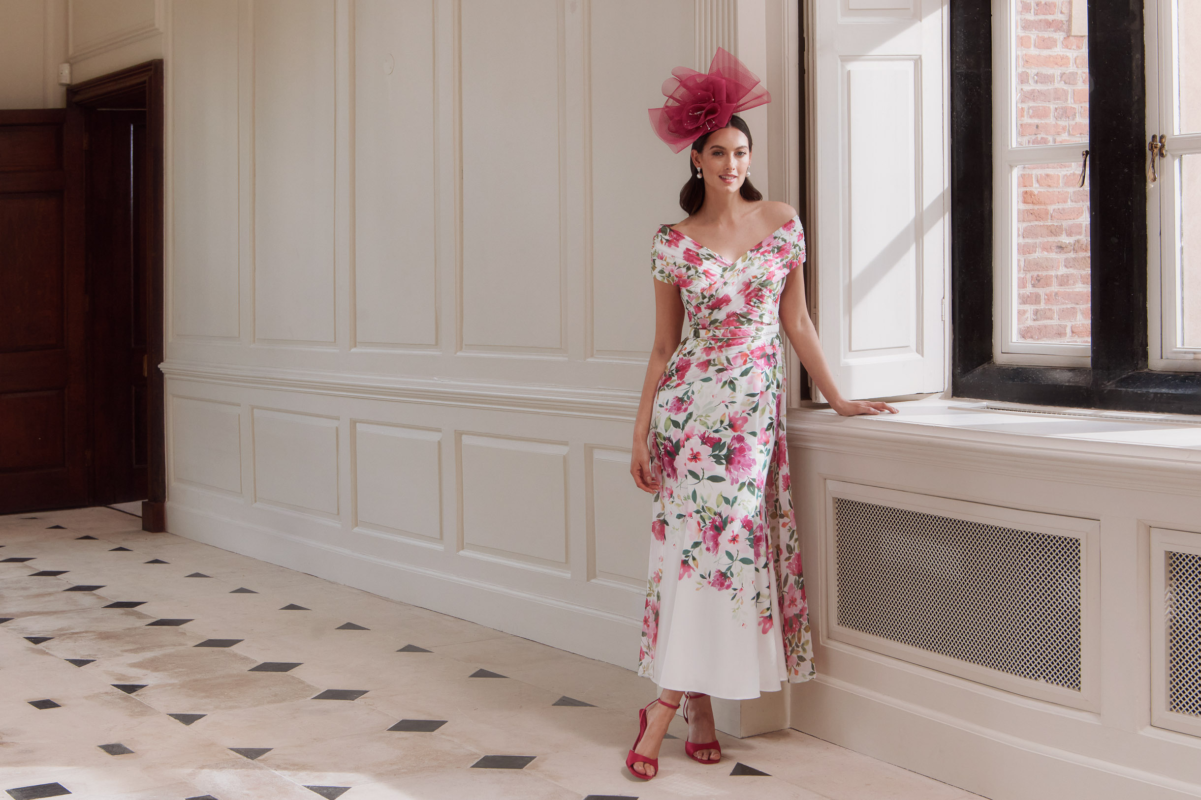 Floral Mother of the Bride dress fitted and flare with floaty overskirt and off the shoulder neckline in pretty shades of pink. Modern, occasion wear for Summer weddings abroad, the races, cruises and garden parties. Matching hats, shoes and bags available.