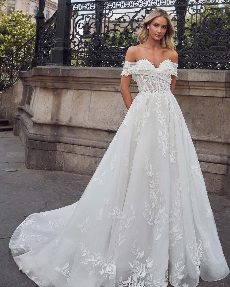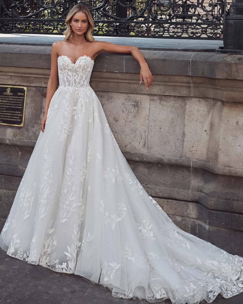 Lace A-line wedding dress with sweetheart neckline and detachable Bardot straps for a stylish switch from ceremony to party. A pretty combination of romantic and chic, this bridal gown has it all. Calla Blanche ranges from £1800 – £3400.