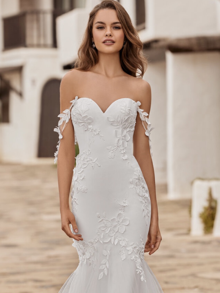 Stunning mermaid wedding dress with sweetheart neckline, plain bodice, statement 3D lace embellishment and pretty tulle skirt. An unforgettable combination of bridal glamour and understated elegance. Price range £1750 – £2000