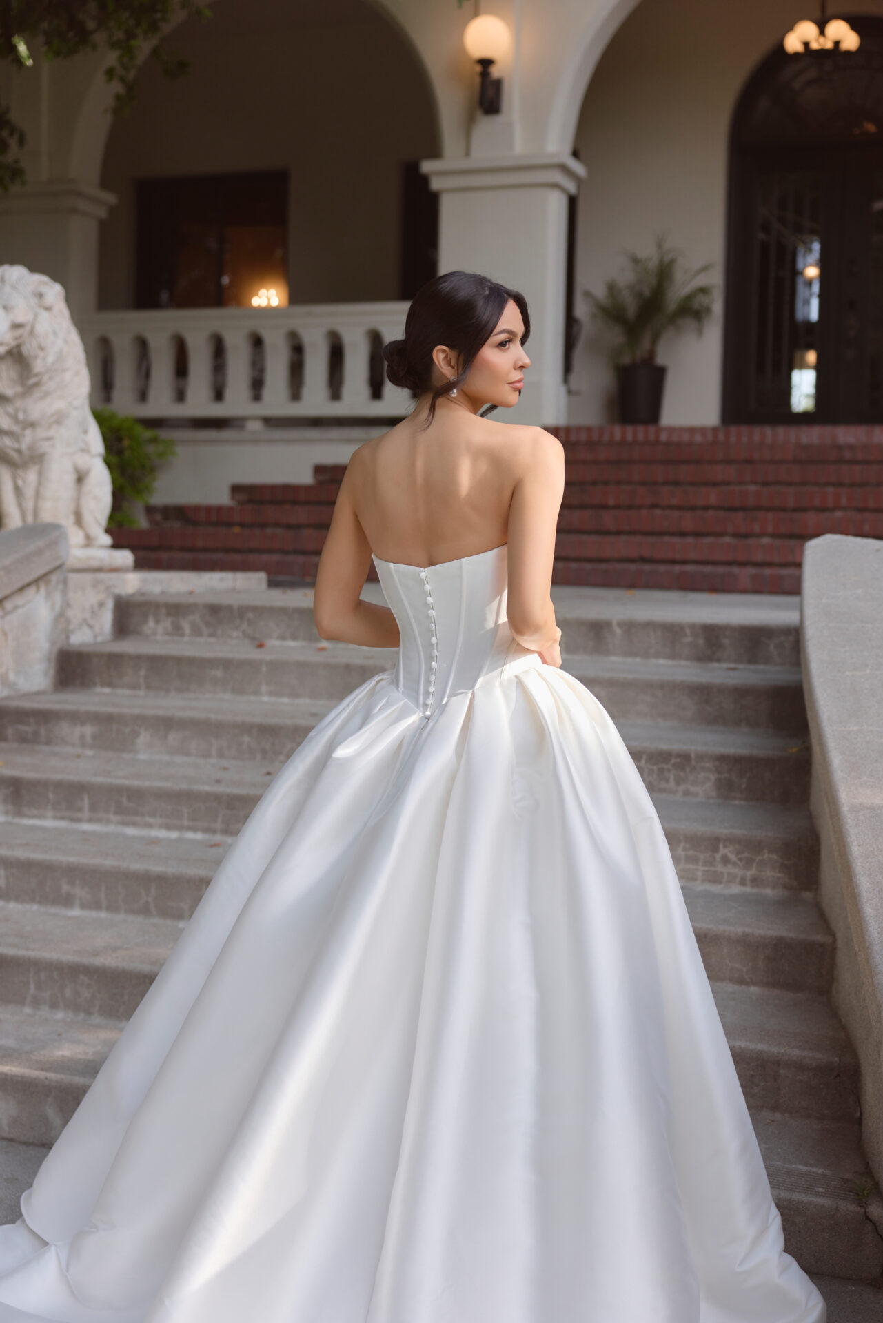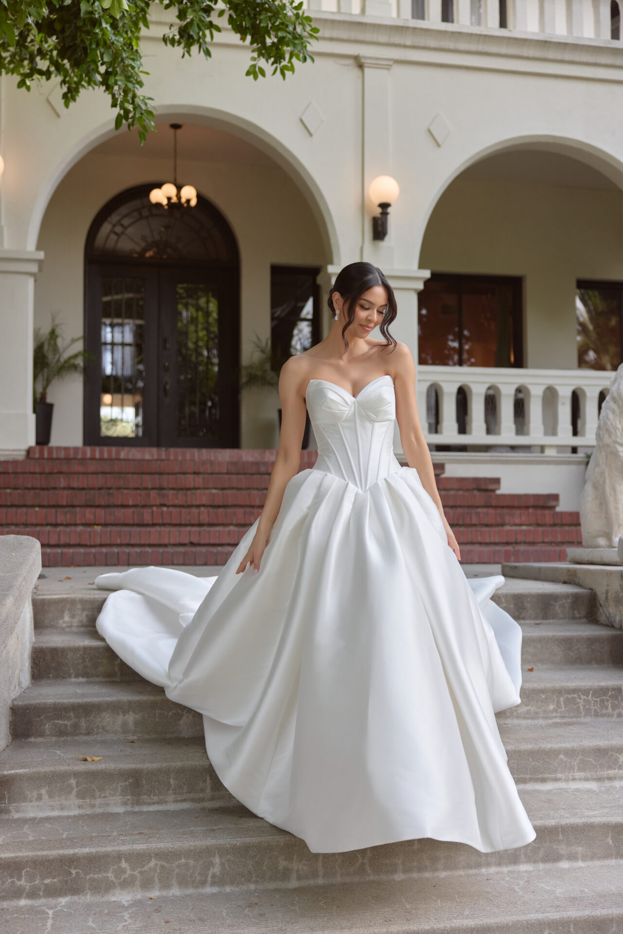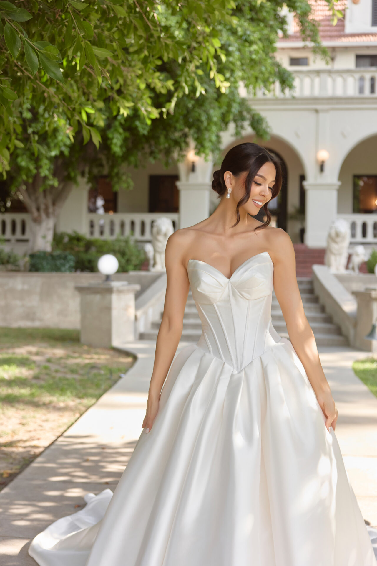 Beautiful ballgown wedding dress in plain mikado with stunning drop waist boned basque bodice. Simply stunning and utterly unforgettable.