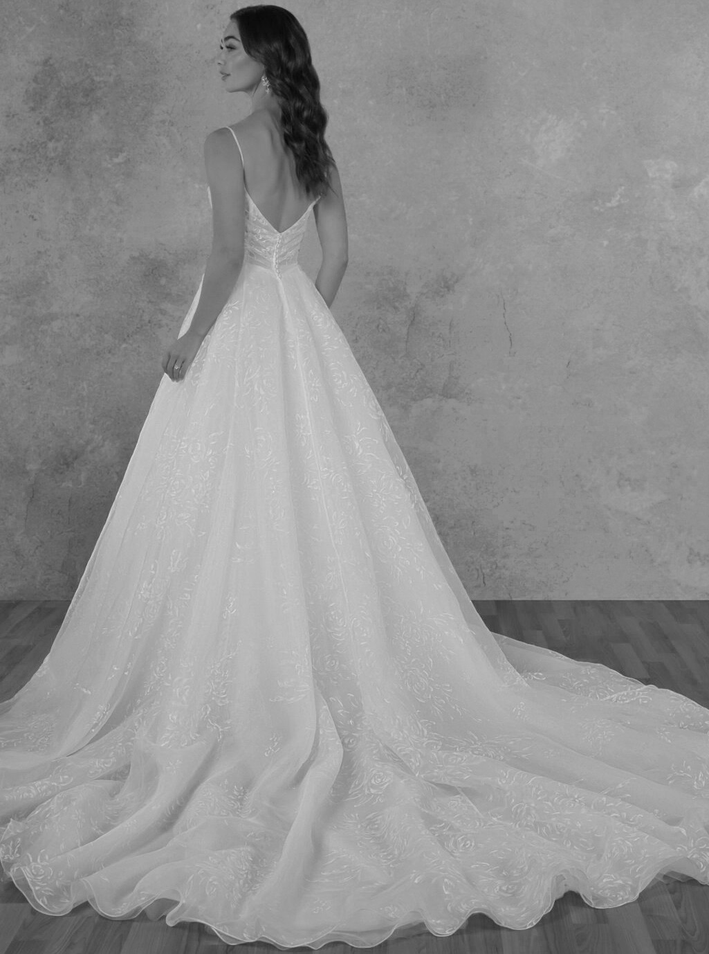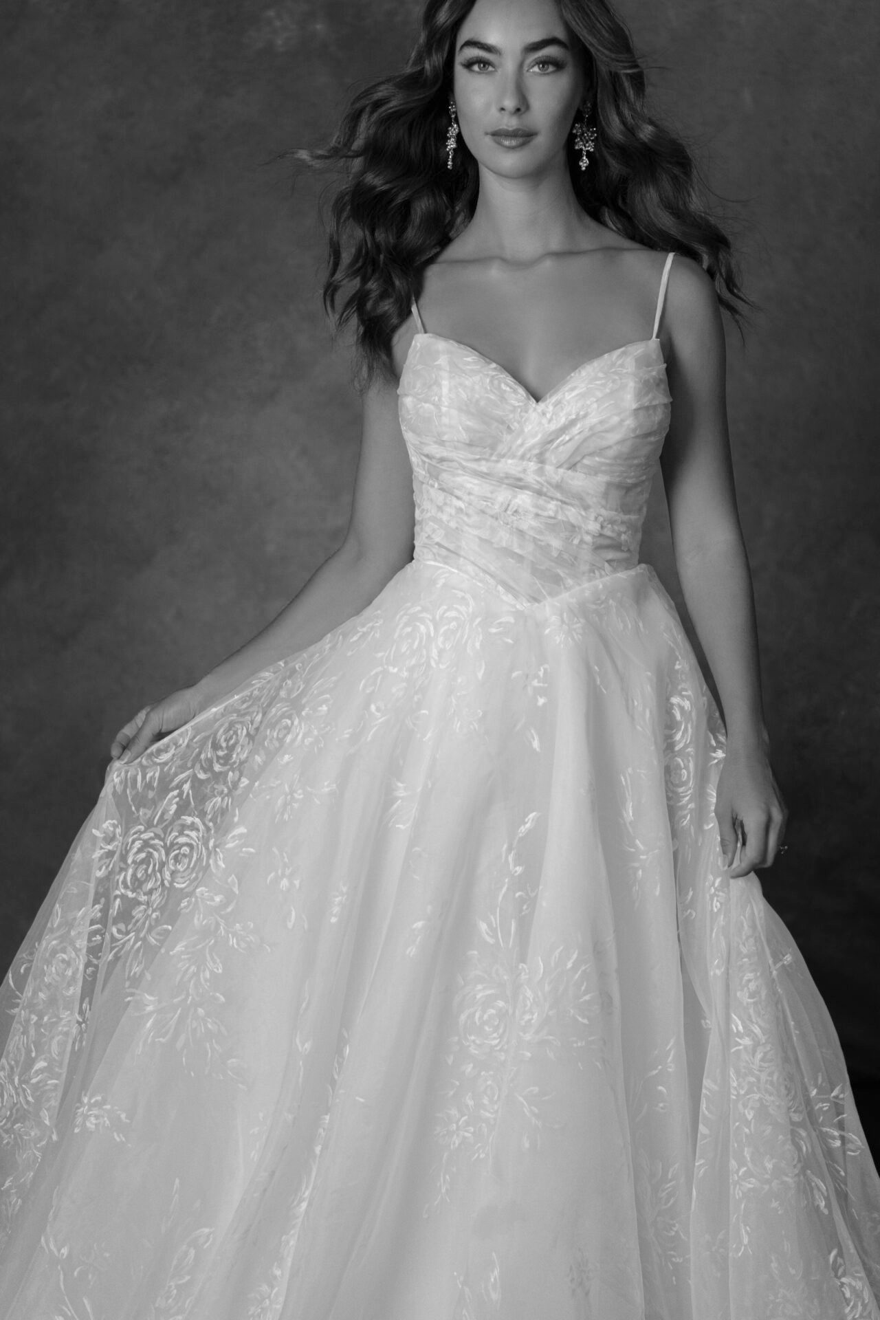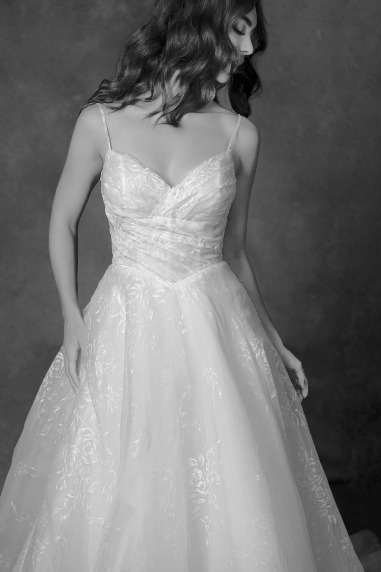Light A-line wedding dress with flattering rouched bodice, spaghetti straps and subtle basque waistline in ivory floral printed organza with softly flowing skirt. Effortlessly elegant romance.