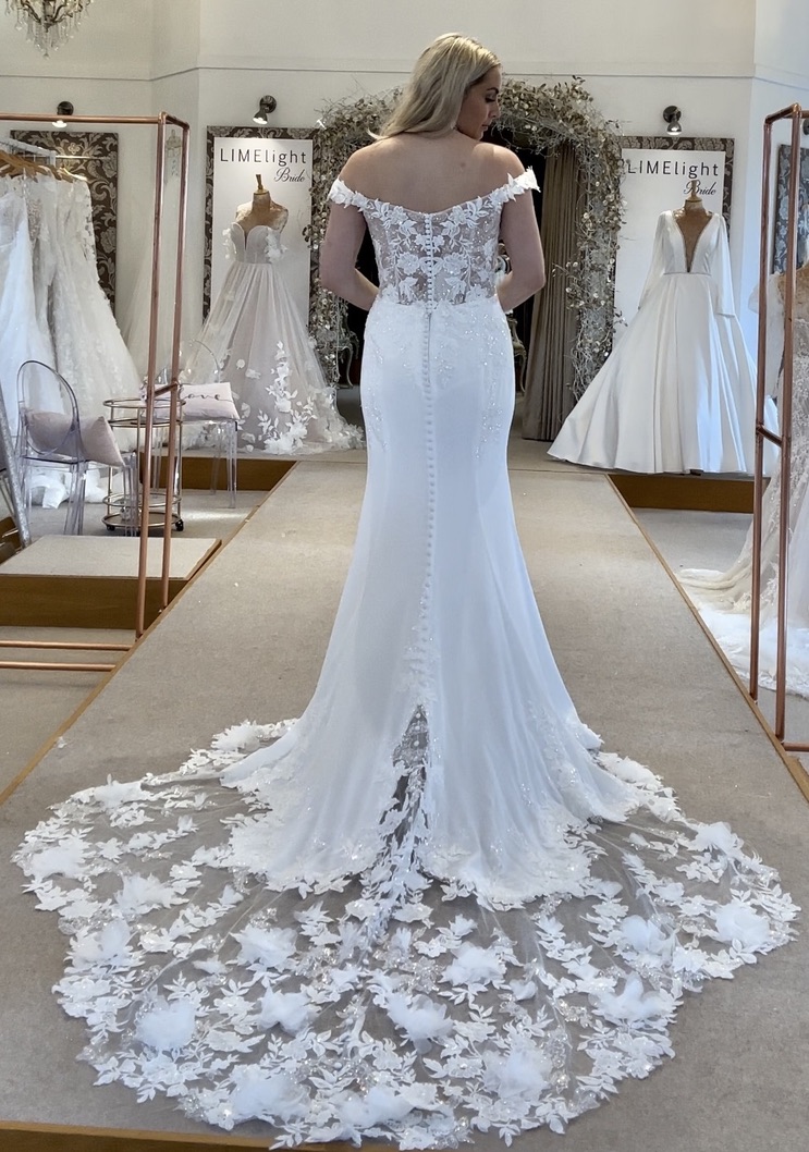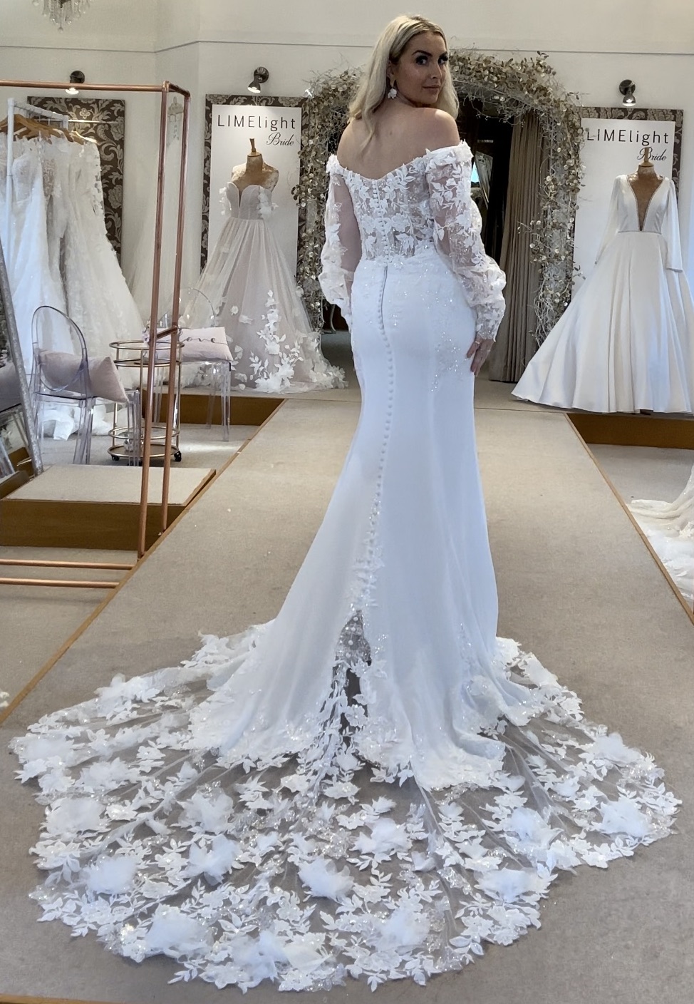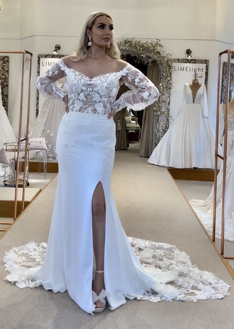 Stunning lace wedding dress with plain fitted crepe skirt with leg reveal, off the shoulder lace bodice with long detachable sleeves and statement lace train.