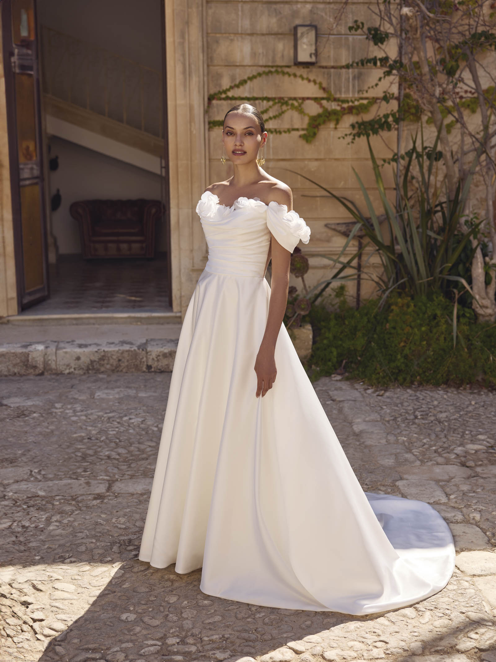 Beautiful ballgown wedding dress in plain satin with statement low boned illusion back, rouched fitted bodice and detachable off the shoulder straps embellished with three dimensional organza flowers. A stunning combination of chic simplicity and bridal romance.