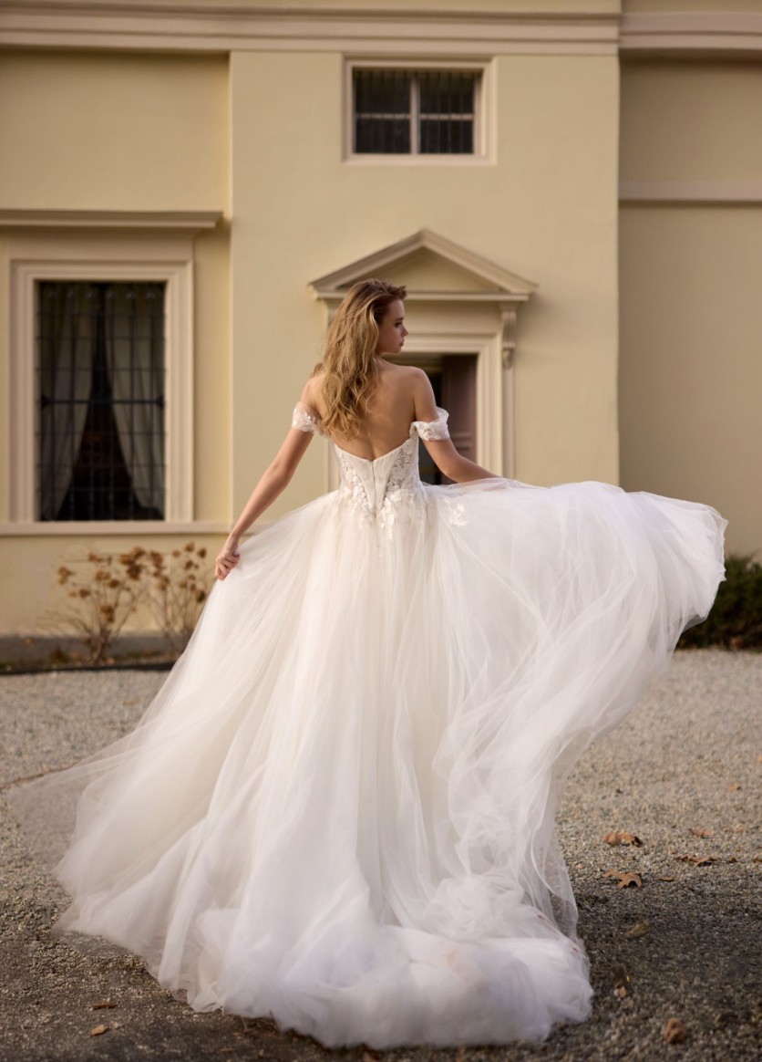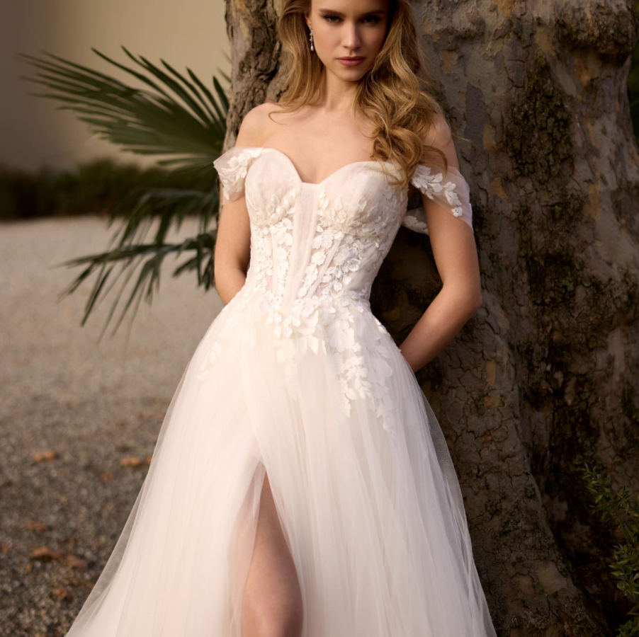 Romantic A-line wedding dress in the softest tulle with drop straps, pretty basque sweetheart bodice and lace detail cascading onto the plain skirt. Softly flowing gorgeousness. To order to standard size. A size 8 sample is available to buy off the peg in store price £1470