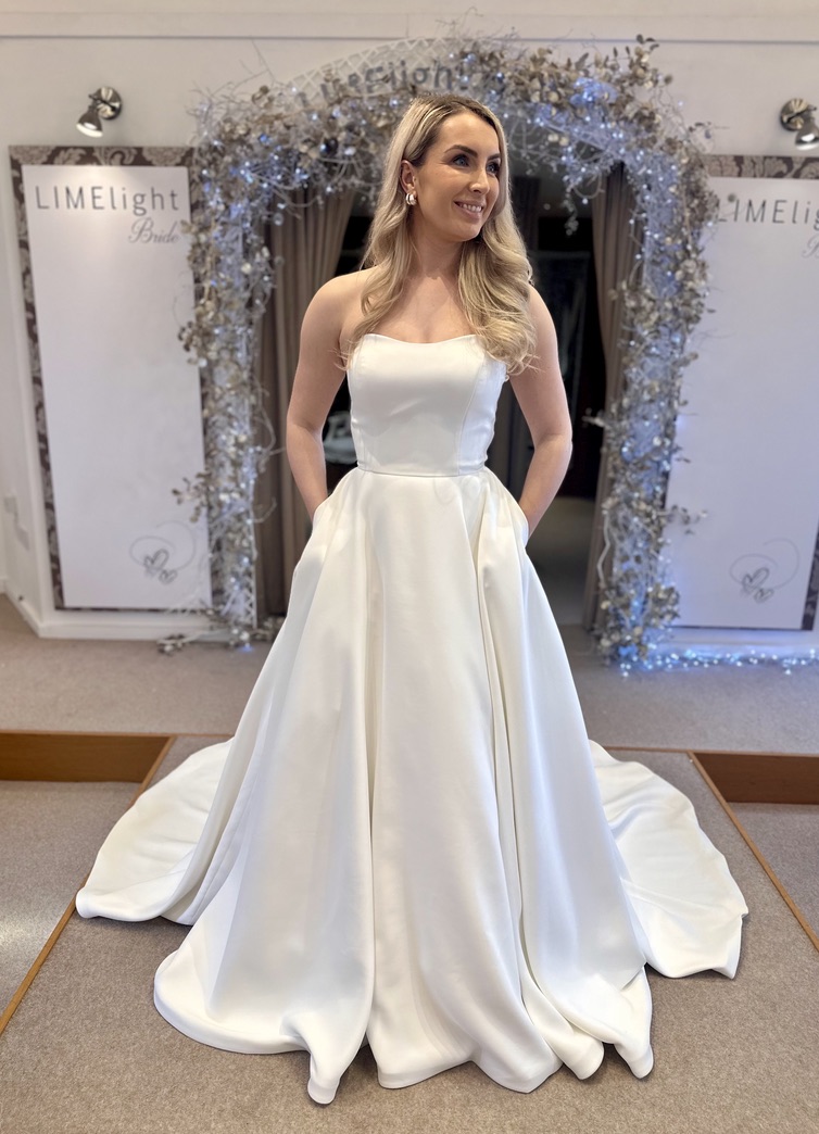 Simply stunning wedding dress in plain satin with an A line skirt, scoop neckline and low back with bow detail. Exclusive to Limelight and a perfect example of less is more when it comes to a jaw dropping bridal statement.